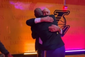 詹姆斯比赛开始前,在球员通道对曾经的主教练莱利表达了祝贺,热火官方社媒也发布了两人拥抱的瞬间。