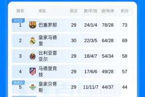 体育资讯4月5日讯 今日西甲,皇马客场1-2爆冷不敌保级球队马略卡,最新积分榜如图,北京时间凌晨三点巴萨将客战马竞。