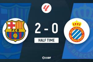 上半场补时3分钟,巴萨2-0西班牙人。