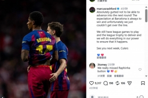 体育资讯4月15日讯 在欧冠1/4决赛,巴萨总比分2-3被马竞淘汰,拉什福德也在个人社媒发文谈到自己的感受。